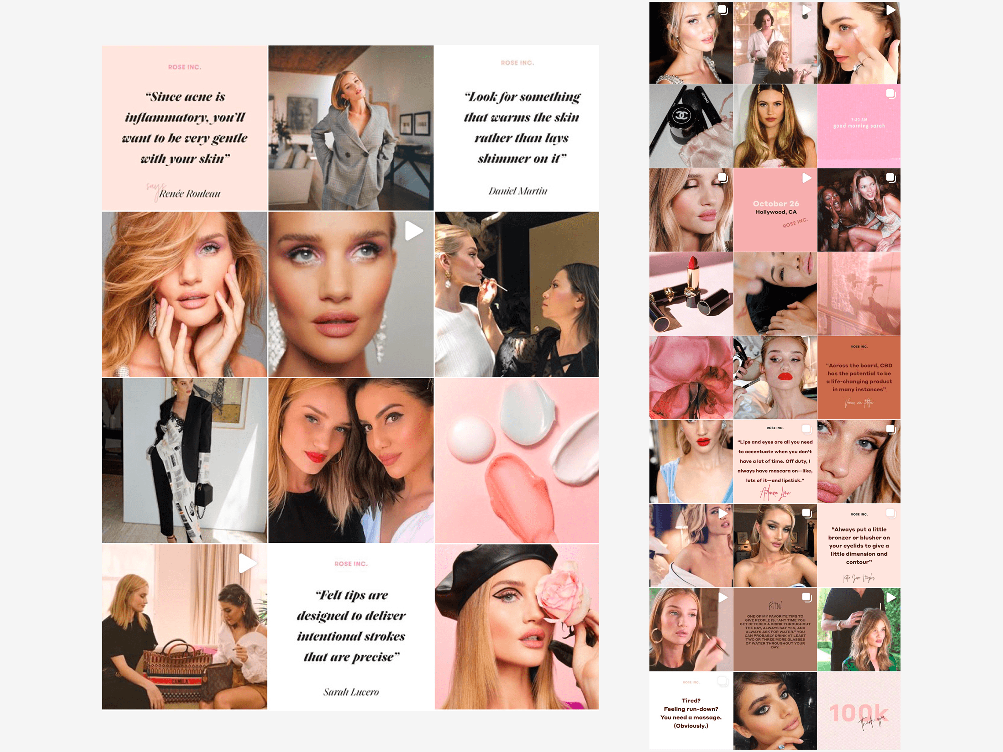 At Rose Inc, I worked closely with founder Rosie Huntington-Whiteley to shape and grow the brand from its early days as a beauty editorial platform into what would eventually become a fully realized makeup line. As Social Media Manager, I focused on content strategy, visual curation, and designing assets—helping establish a cohesive and elevated presence that reflected the brand’s evolving identity. My work supported Rose Inc’s transition into a modern, education-driven beauty brand rooted in elegance and intention.